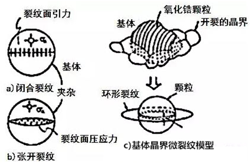 誘發(fā)微裂紋增韌主要有三種方法:1、完成燒結(jié)后,溫度降低過程中,自然產(chǎn)生;2、燒結(jié)溫度過高,晶粒異常長(zhǎng)大,產(chǎn)生微裂紋;3、材料受到外界應(yīng)力作用。然而微裂紋增韌只增加了陶瓷集體的韌性,而對(duì)其強(qiáng)度是有很大的影響的,因此實(shí)際操作中,應(yīng)適當(dāng)控制微裂紋的產(chǎn)生。