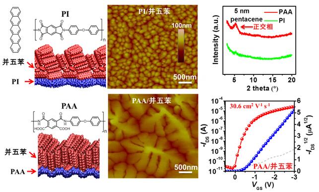 圖3 并五苯在PI和PAA表面的生長方式、薄膜形貌、結晶性以及電學性質(zhì)