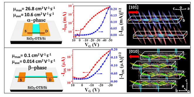 有機分子大多是通過極弱的范德華力相互作用而形成晶體,因此多晶相是有機半導體材料中非常普遍的一種現(xiàn)象。不同堆積結構的晶相具有不同的電子耦合作用,從而導致不同的電荷傳輸行為。如何可控組裝生長高遷移率的晶相一直以來都是分子電子學中一個極具有挑戰(zhàn)性的課題,涉及到分子結構、晶體工程和超分子自組裝等多方面的內(nèi)容。