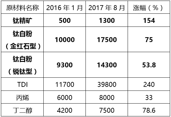 從上圖看出,自環(huán)保督察持續(xù)的近兩年時間里,鈦精礦漲幅達154%、鈦白粉(金紅石型)漲幅75%、鈦白粉(銳鈦型)漲幅53.8%、TDI漲幅達240%。