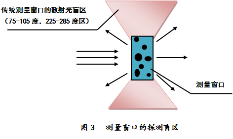 無(wú)論是何種設計的激光粒度儀,都存在一個(gè)測量窗口,樣品在窗口中充分分散,被激光照射,產(chǎn)生散射光。如圖3所示,傳統測量窗口由于機械結構和光學(xué)玻璃存在全反射,總是存在一個(gè)散射光探測盲區。這個(gè)盲區大致分布在75-105度、255-285度區域內。